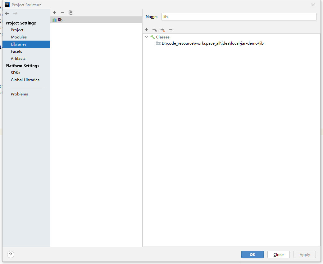 选择本地jar包所在目录并确认应用,这里我在当前项目下新建了名为lib的Directory,本地jar包都移到这里面